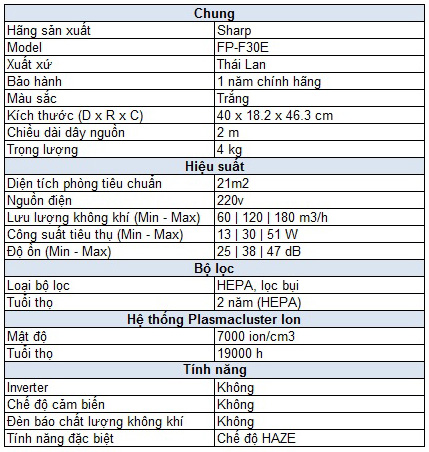- Xuất xứ Thái Lan là một điểm cộng, cùng mức giá phù hợp nhưng lại có chất lượng cao, bạn sẽ vô cùng hài lòng khi sở hữu máy lọc không khí Sharp FP-F30E